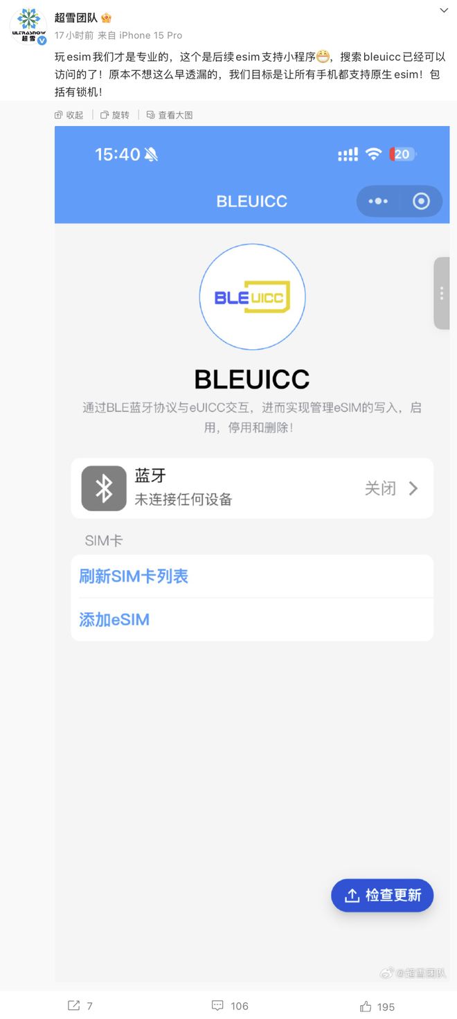 值得一提的是,今年 10 月,超雪團隊發文,稱其 eSIM 小程序“bleuicc”已正式上線,目標是“讓所有手機都支持原生 eSIM,包括有鎖機”。參考小程序頁面,其中顯示該團隊使用藍牙寫入 / 啟停 eSIM。