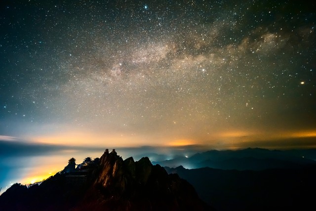 那是一個八月的黃昏,金殿的燈火剛剛點亮,天邊的夕陽卻不肯退場,一場雨后,山間的水汽被陽光蒸騰,化作繚繞的云霧。風仿佛一位技藝高超的指揮家,恰到好處地引導著霧氣,讓它們溫柔地環抱住山頂的建筑。落日的光輝穿透云層,為這流動的紗幔鍍上了一層耀眼的金邊,整個場景如夢似幻,宛如仙人設下的結界,守護著這座人間圣境。魏暐自己都坦言,這樣的景象可遇不可求,有時燈亮了霧卻沒來,有時霧氣繚繞燈光卻未亮,還有時無人機飛起時機稍縱即逝。天時、地利、人和,缺一不可,能拍到這一幕,真是三生有幸。